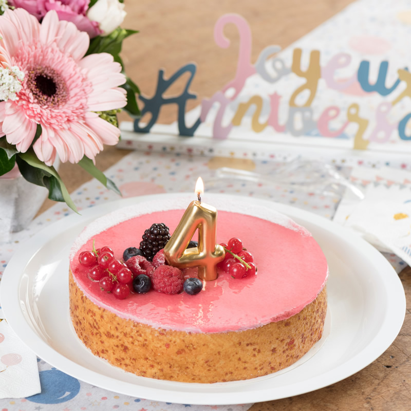 Bougie chiffre « 4 » or brillant sur pique pour la disposer sur le gâteau d’anniversaire. Dimensions : 4 x 9cm environ.