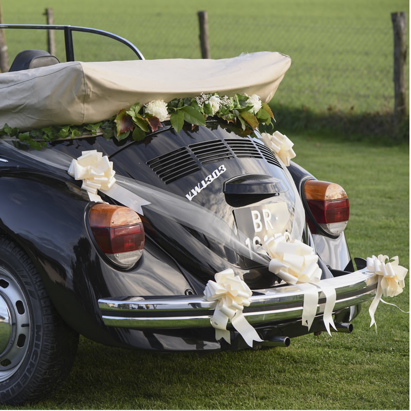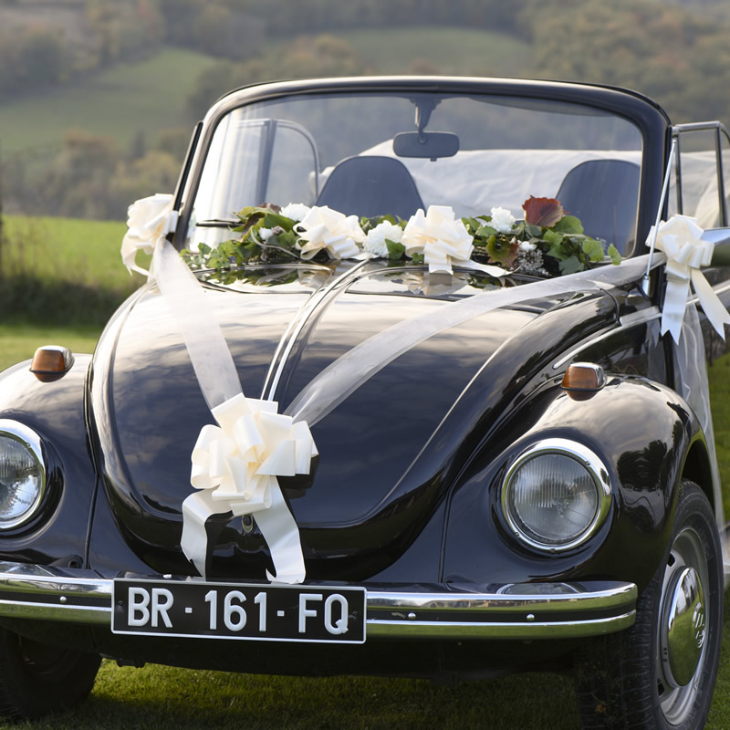Kit de décoration de voiture ivoire composé d’une bobine de tulle de 8cm x 10m, de 4 petits nœuds et d’un grand noeud automatique en polypropylène.