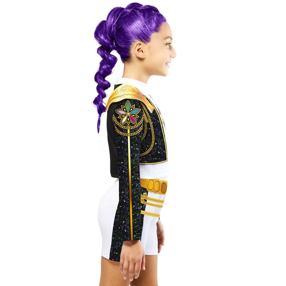Une veste en jersey imprimée noire et or à manches longues avec top blanc intégré, et épaulette dorée en feutrine.