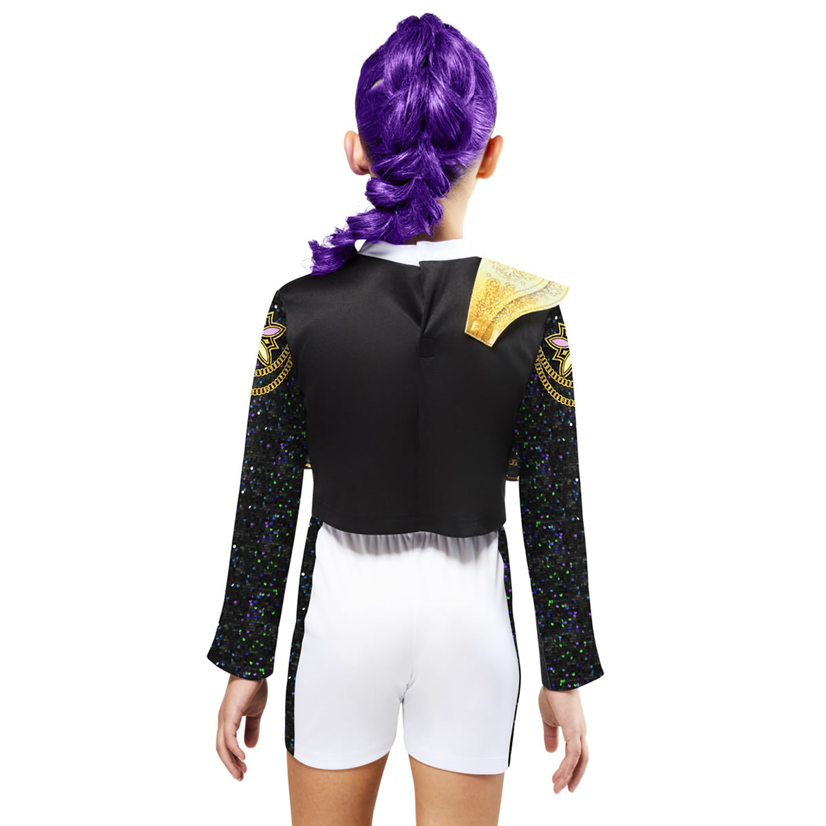 Une veste noire et or à manches longues ornée de sequins et d’une épaulette dorée en mousse avec attache velcro.